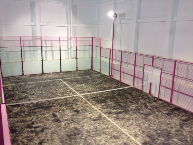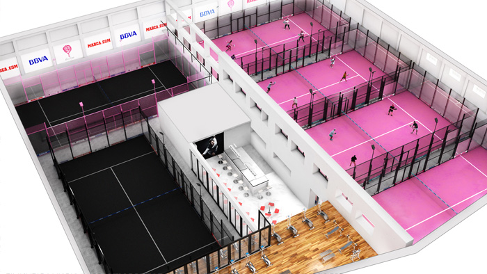 Its boldness and peculiarity is that it has 4 Aday Model padel courts, with fuchsia (pink) grass, and 2 Pro Model central courts, with black grass, one of them even with black sand to better see the ball, and another with fuchsia structure and black grass.